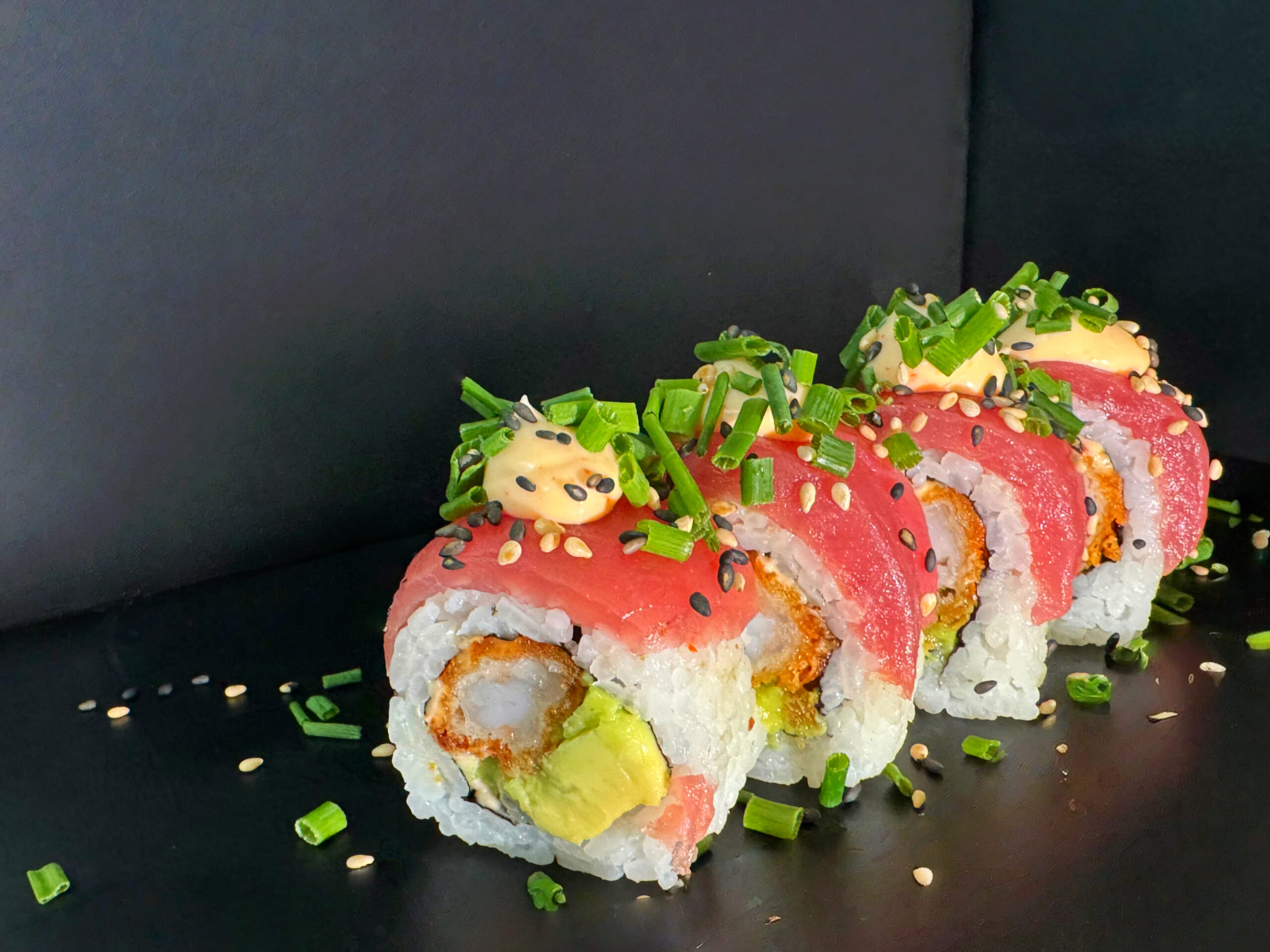 Crispy ebi roll topped med tun,, chilimayo forårsløg og sesame