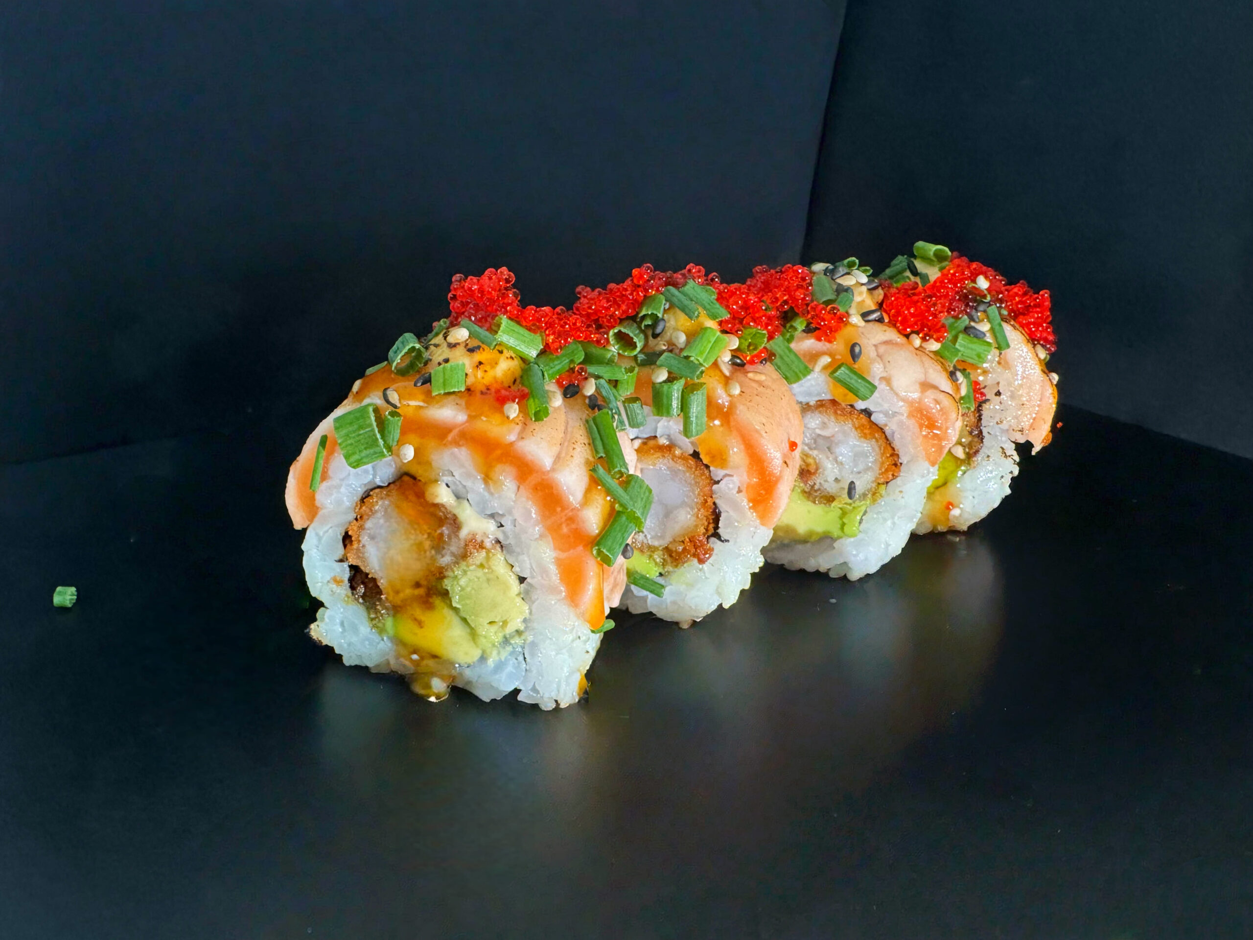 Crispy ebi roll topped med flamberet laks, teriyai, spicy dip, tobiko og forårsløg. sesame