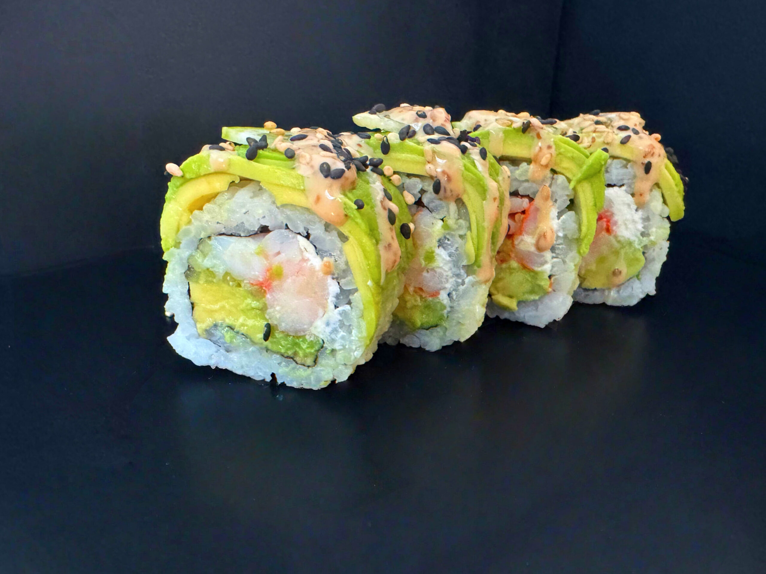 Reje, cream cheese, agurk,topped med avocado, lime og Goma dip