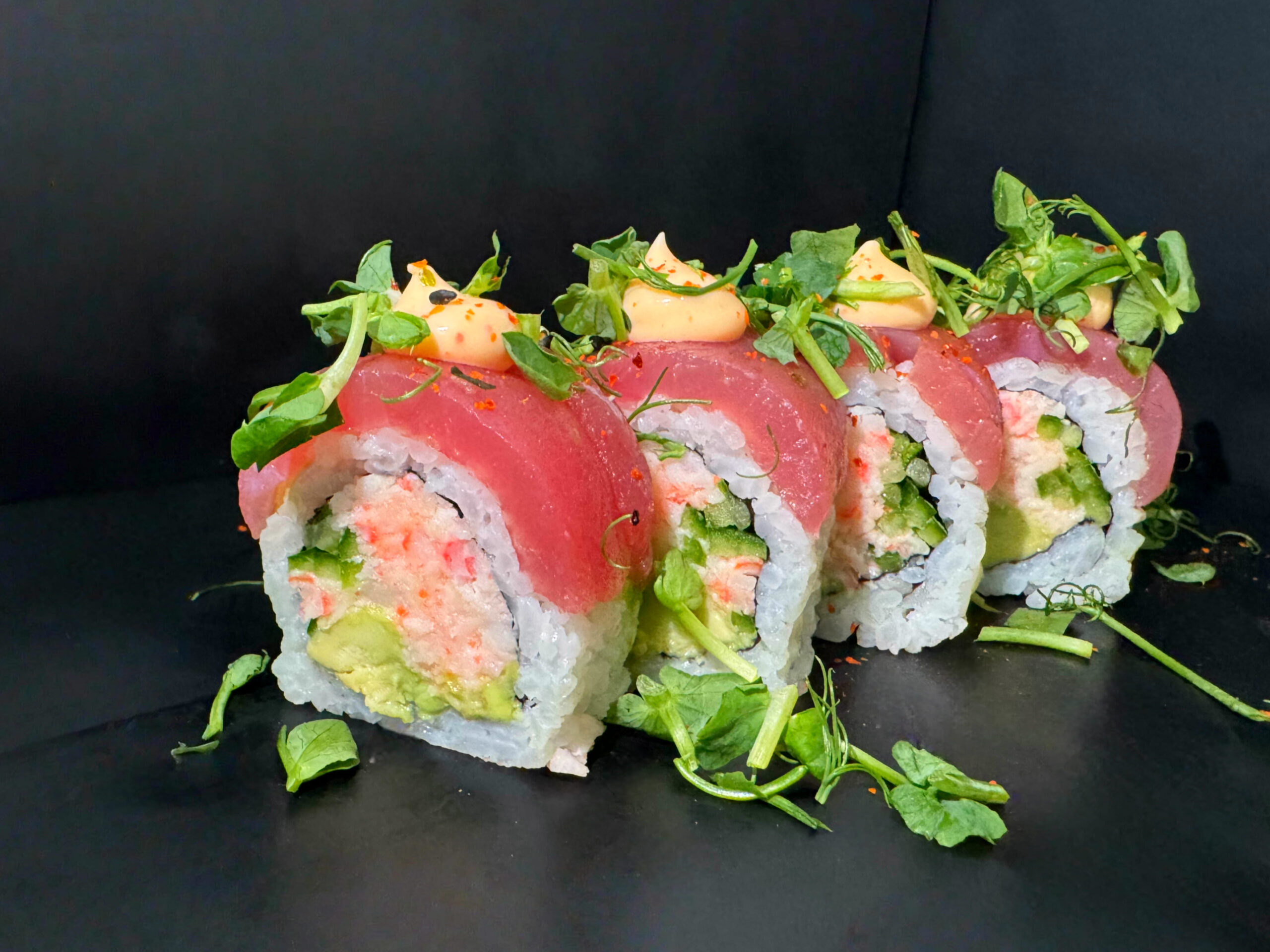 Surimi roll topped med tun, spicy dip, bønnespirer, rogn og Shichimi